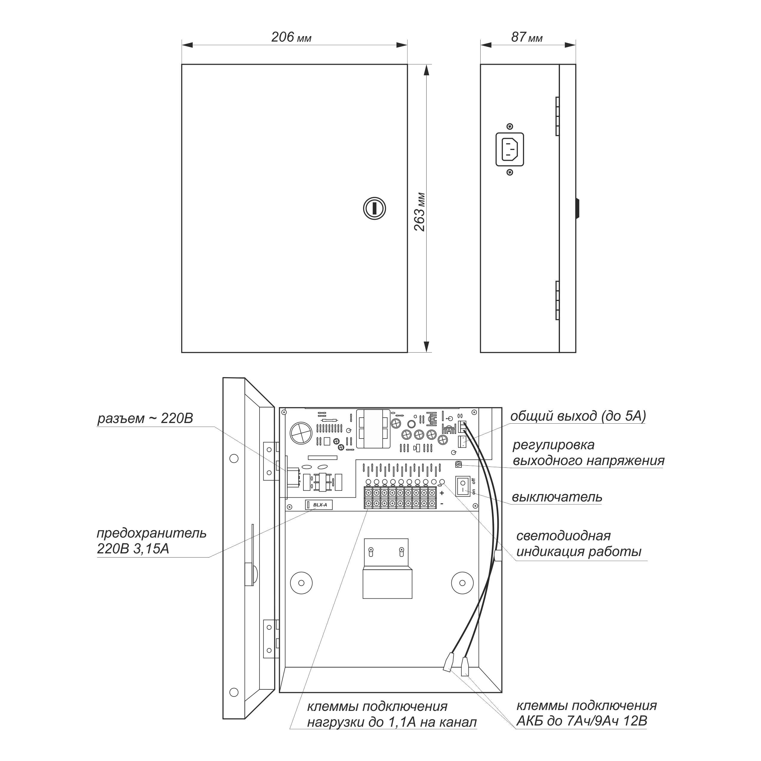 Многоканальный резервируемый блок питания. Вход 110-240В 50Гц. Выход: 12-15В (регулируемый), 10А (регулируемый), 9 каналов с защитой по току 2,2А, (самовосстанавливающиеся предохранители). Тип используемого аккумулятора: кислотно-свинцовый 7,2 Aч (151x 65x95 мм) 9,0 Aч (151x 65x95 мм). Номинальный зарядный ток 0.3 А. Уровень автоматического отключения для исключения глубокого разряда АКБ 10B. Диапазон рабочих температур -10°C до + 50°C, Габаритные размеры: 85х205х265 мм, Вес 2250 г, без АКБ. Материал корпуса металл, IP43. Особенности: Исполнение - металлический ящик с дверцей и креплением на стену, отсутствует задержка переключения на резервное питание, защита от короткого замыкания, фильтр сетевых помех, сетевой предохранитель и выключатель, общий выход с защитой от перегрузки блока 10А, светодиодная индикация состояния каналов.