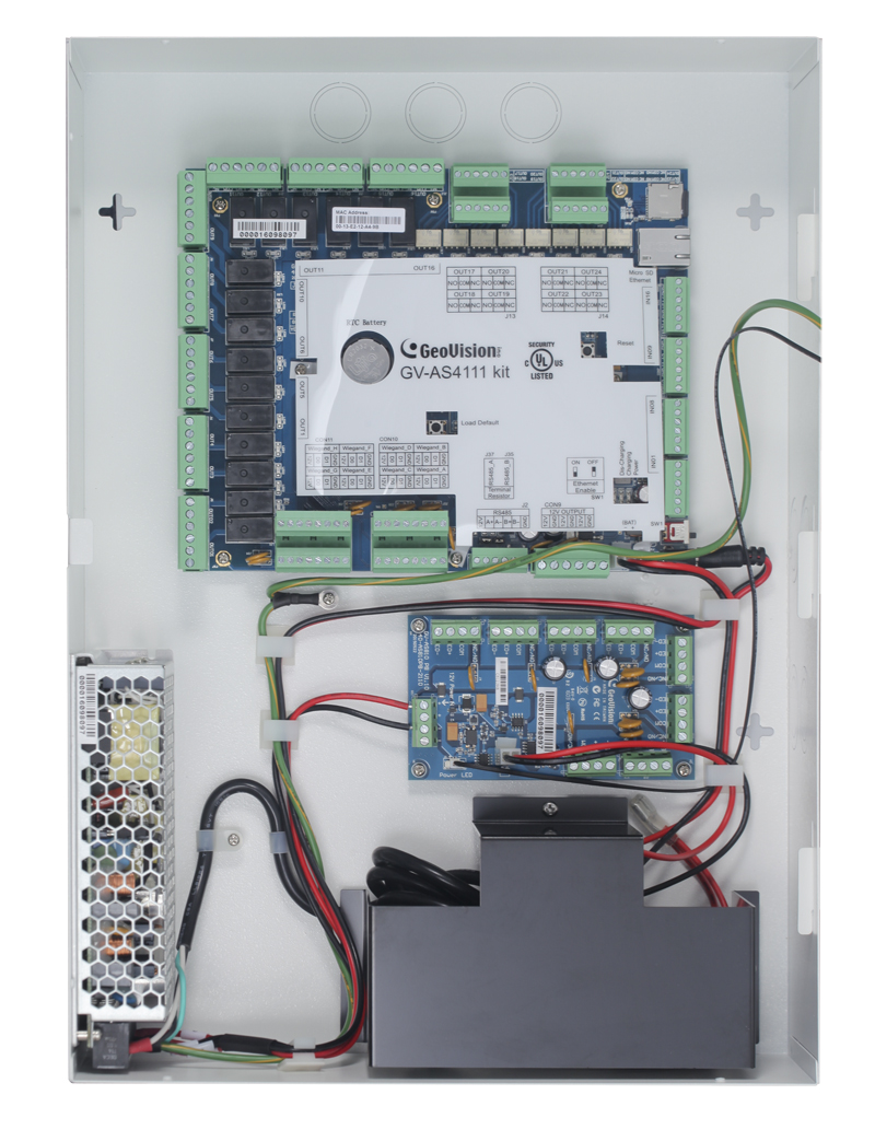 Контроллер GV AS-4111 KIT. Контроллер на 4 двери (односторонний и двухсторонний проход). Включает в себя AS4111, источник питания и место под аккумулятор в металлическом корпусе.Подключение RS485/LAN, до 8 Weigand считывателей, до 8 GV-Reader и GV Fingerprint Readers, 16 входов, 24 релейных выхода. Источник питания позволяет подключить до 8 выходных устройств с питанием 12В 0.5В