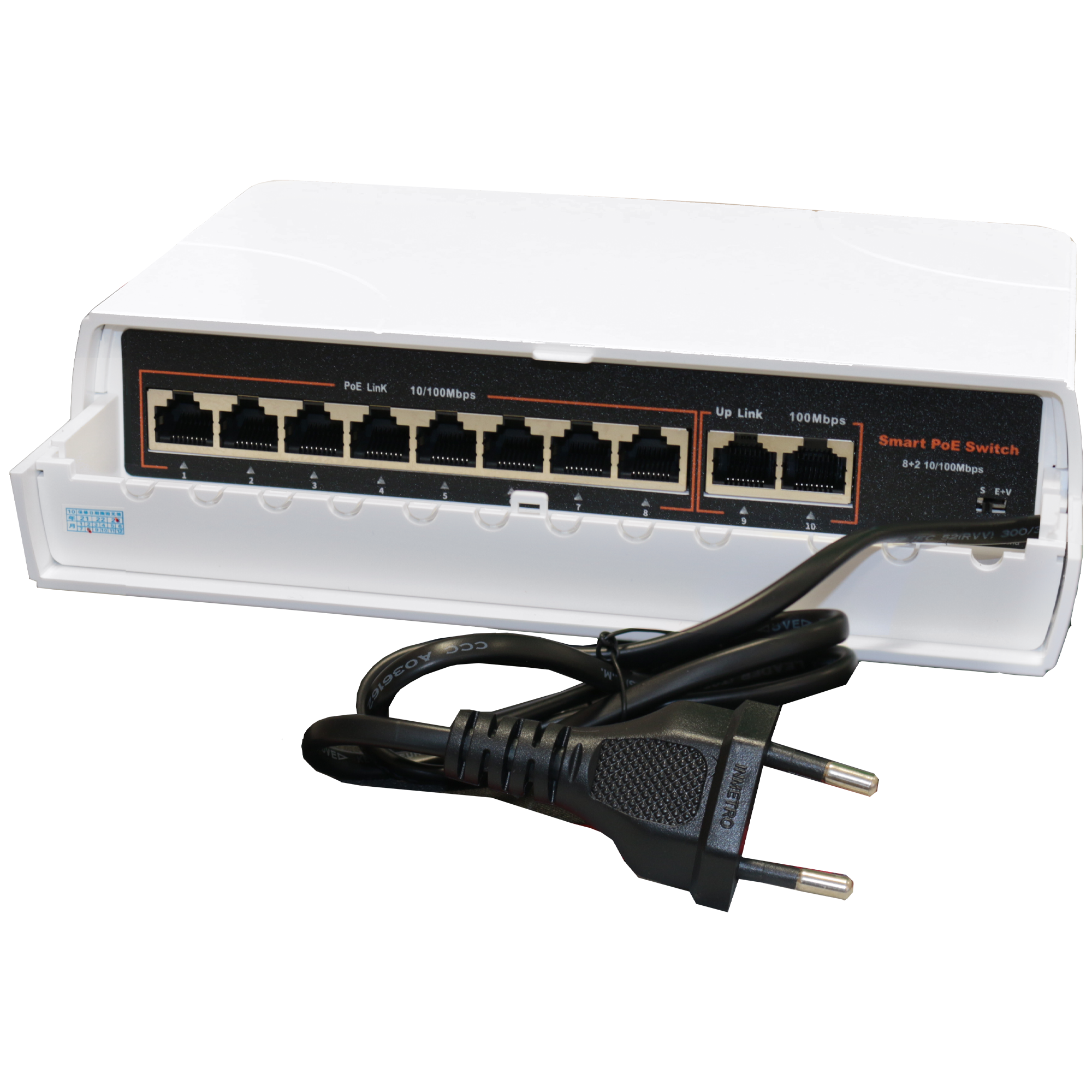 8 PoE портов 10/100мбит/с Base-TX, 2 Uplink порта 10/100мбит/с UPLink port.