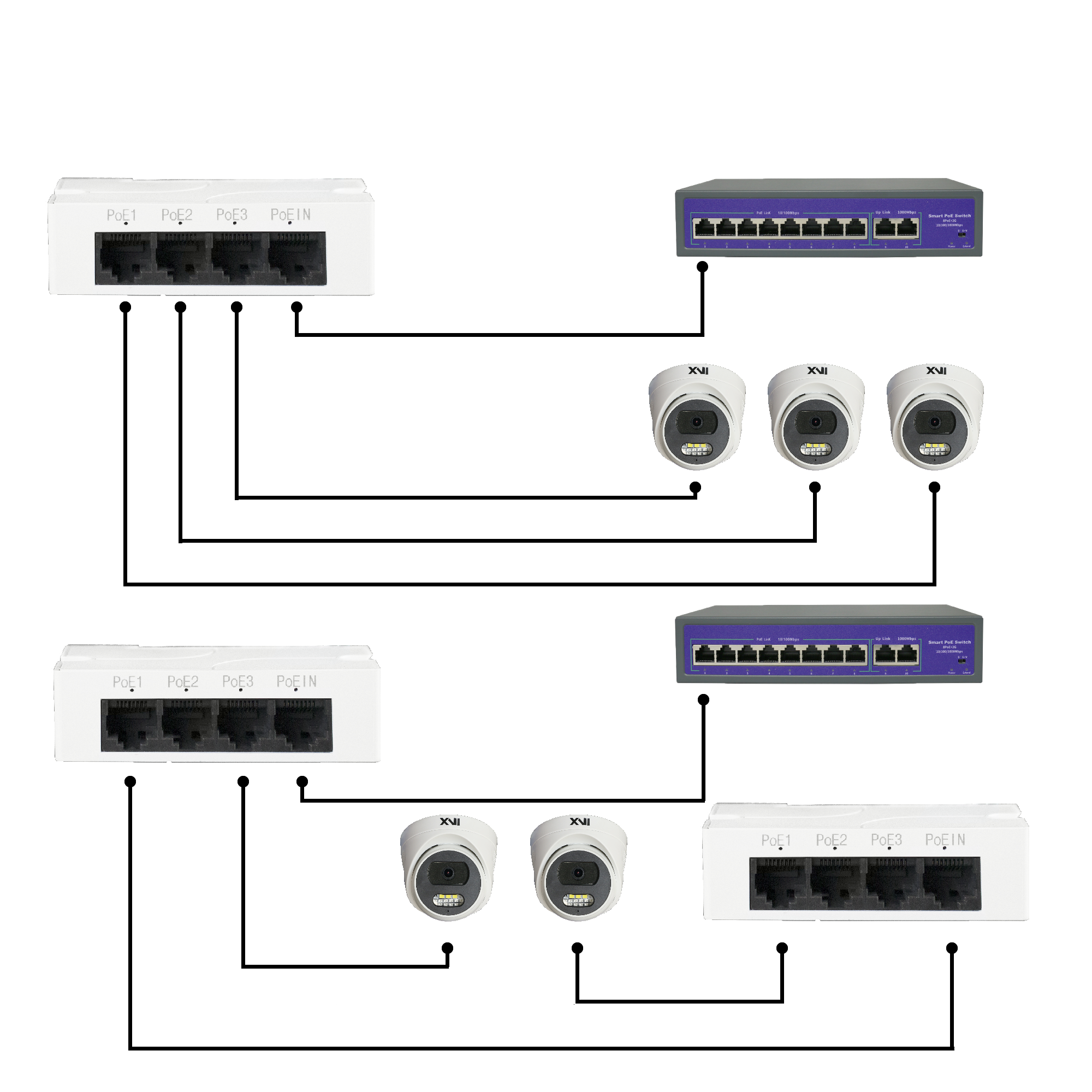 - Поддерживает подключение входа к коммутатору с питанием PoE до 30вт IEEE802.3at (любые коммутаторы XVI), при этом позволяет подключить на выход суммарную по 3 линиям нагрузку мощностью до 25Вт.